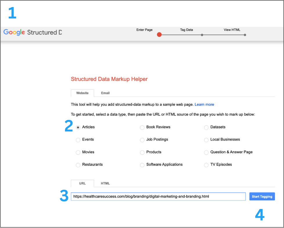 - Go to Google’s Structured Data Markup Helper Tool.