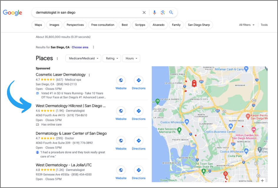 Local SEO ensures your online presence targets nearby individuals actively seeking your medical services. Including local keywords (e.g., Dermatologist in San Diego, CA) naturally in copy and headers improves your chances of attracting local, high-intent, and potential patients to your organization.