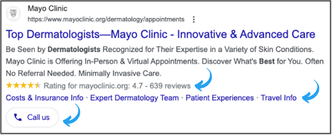 Healthcare organizations can leverage schema markup to highlight things users often search for (e.g., contact information, medical specialties, accepted insurances, business hours, location, patient testimonials, and more) directly on the SERP.
